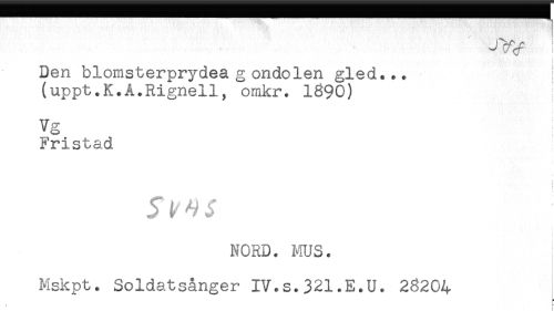 //// Den blomsterprydea g ondolen gled... //// (uppt.K.A.Rignell, omkr. 1890) //// Vg //// Fristad //// ! //// < //// NORD. MUS. //// Mskpt. Soldatsånger IV.S.321.E.U. 28204 ////