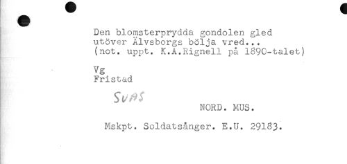 //// Den blomsterprydda gondolen gled //// utöver Älvsborgs bölja vred... //// (not. uppt. K.A.Rignell på 1890-talet) //// Vg //// Fristad //// NORD. MUS. //// Mskpt. Soldatsånger. E.U. 29183. //// - ////
