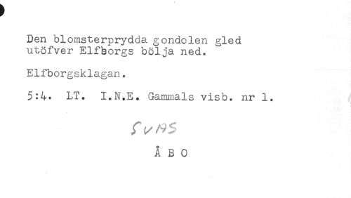 //// Den blomsterprydda gondolen gled //// utöfver Elfborgs bölja ned. //// Elfborgsklagan. //// 5:4. LT. I.N.E. Gammals visb. nr 1. //// -) //// ÅBO ////