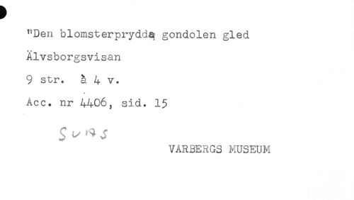 //// t''Den blomsterprydda} gondolen gled //// Älvsborgsvisan //// 9 str. å 4 v. //// Acc. nr 4406, sid. 1$ //// VARBERGS MUSEUM ////