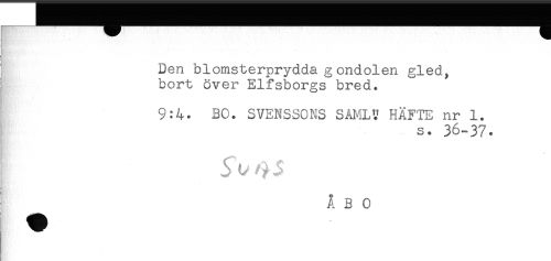 //// Den blomsterprydda g ondolen gled, //// bort över Elfsborgs bred. //// 9:4. BO. SVENSSONS SAMU' HÄFTE nr 1. //// s. 36-37. //// ÅBO ////