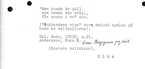//// ^ "Den bonde är säll //// som hemma var kväll, //// får somna i ro" etc. //// ("Kolbondens visa" vara melodi spelas på //// horn av vallkullorna). //// Dal. Boda, 18539, s.31. //// Andersson, Fräs E. ^ //// (Enstaka vallvisor). //// U L M A ////