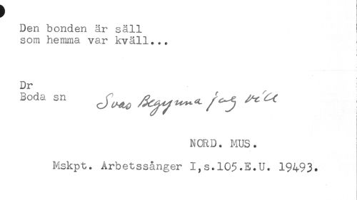 //// Den bonden är säll //// som hemma var kväll... ! //// : //// < //// Dr //// NORD. MUS. //// Mskpt. Årbetssånger I,s.l05.E.U. 19493. ////