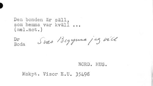//// Den bonden år säll, //// som hemma var kväll ... //// (mel*not.) //// ^ J ^ ^ ^ < / ' 3 ^ ^ //// NORD. MUS. //// Mskpt. Visor E.U. 35496 ////