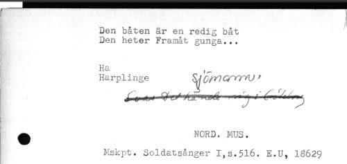 //// K.-- . " ' : ' — .....-- H //// - * f ^ ^ F! //// Den båten är en redig båt //// Den heter Framåt gunga... //// ! Ha ^ //// ^ Harplinge //// ^ NORD. MUS. //// Mskpt. Soldatsånger I,s.516. E.U, 16629 ////