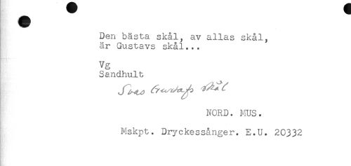 //// Den bästa skål, av allas skål, //// är Gustavs skål... //// Vg //// Sandhult //// NORD. MUS. //// Mskpt. Dryckessånger. E.U. 20332 ////