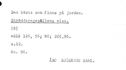 //// Den bästa som finns på jorden. //// Skräddaregesållens visa. //// (R) //// =SLS 126, 56; R6; 205,96. //// s.22. //// No. 96. //// ÅSO SJÖBERGS SAML. ////