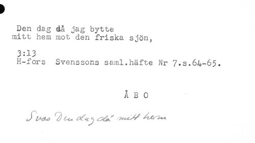 //// Den dag då jag bytte //// mitt hem mot den friska sjön, //// 3:13 //// H-fors Svenssons saml.häfte Nr 7.s.64-65. //// ÅBO //// J ^^ ^ '.'..t, ^ , ////