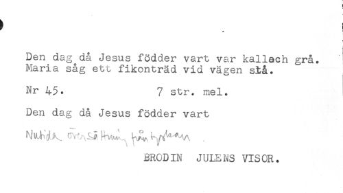 //// ) i //// Den dag då Jesus födder vart var kallach grå. //// Maria såg ett fikonträd vid vägen stå. //// Nr 45. 7 str. mel. //// Den dag då Jesus födder vart //// BRODIN JULENS VISOR. ////