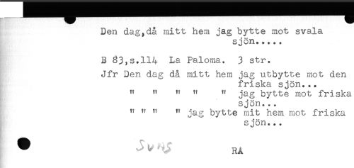 //// - //// Den dag,då mitt hem jag bytte mot svala //// * * -__ //// Sjon. * + *. //// B 331s.114 La Paloma. 3 str. //// Jfr Den dag då mitt hem jag utbytte mot den //// friska sjön... //// " " " " ^ jag bytte mot friska //// sjön... //// " ^ ^ ^ jag bytte mit hem mot friska //// sjön... //// * ^ ^ RA ////