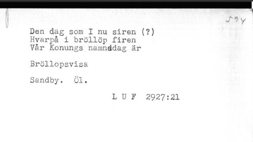 //// fj : //// V ^ : //// Den dag som I nu siren (?) //// Hvarpå i bröllop firen //// Vår Konungs namnddag är //// Bröllopsvisa //// Sandby. öl. //// L U F 2927:21 ////