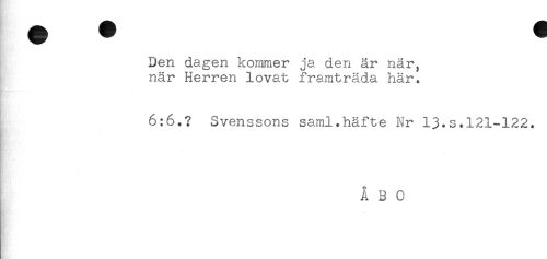 //// Den dagen kommer ja den är när, //// när Herren lovat framträda här. //// 6:6.? Svenssons saml.häfte Nr 13.s.121-122. //// * <* //// ÅBO //// f ////