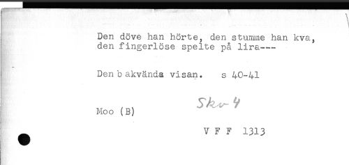 //// i . i //// i Den döve han hörte, den stumme han kva, //// ] den fingerlöse spelte på lira--- //// Den bakvända visan. s 40-41 //// Moo (B) //// ^ VFF 1313 ////
