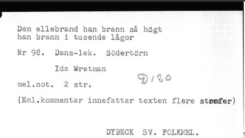 //// Den ellebrand han brann så högt //// han brann i tusende lågor //// Nr Dans-lek. Södertörn //// Ida Wretman //// mel.not. 2 str. //// (Enl.kommentar innefattar texten flere stpofer) //// DYBECK SV. FOLKMEL. //// r ////