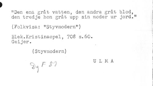 //// "Den ena gråt vatten, den andra gråt blod, { //// den tredje hon gråt upp sin moder ur jord." //// ! //// (Folkvisa: "Styvmodern") //// t //// t //// j //// Blek.Kristinaopel, 703 s.60. I //// Geijer. //// (Styvmodern) ! //// - //// i //// U L M A ////