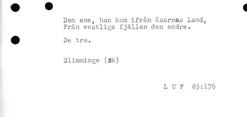 //// Den ene, han kom ifrån åsarnas land, //// Från vestliga fjällen den andre. //// De tre. //// Slimminge (Sk) //// L U F É5:l?6 ////