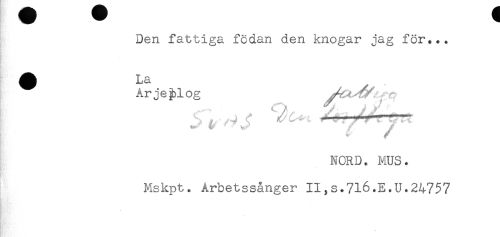 //// Den fattiga födan den knogar jag för... //// Arjeplog //// * //// /NORD. MUS. //// Mskpt. Årbetssånger II,s.716.E.U.24757 ////