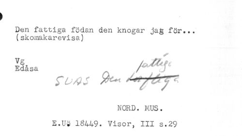 //// ) //// Den fattiga födan den knogar jag för... //// (skomakarevisa) //// I^asa ^ A^f //// NORD. MUS. //// E.Uc 18449. Visor, III s.29 ////