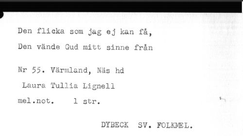 //// Den flicka som jag ej kan få, //// Den vände Gud mitt sinne från //// Nr 55. Värmland, Näs hd //// Laura Tullia Lignell //// mel.not. 1 str. ' //// DYBECK SV. FOLKMEL. ////