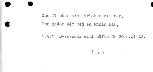 //// Den flickan min kärlek tagit har, //// ^ hon sedan går med en annan kar, //// 9:4.? Svenssons saml.häfte Nr 20,s.41-42, //// ÅBO ////