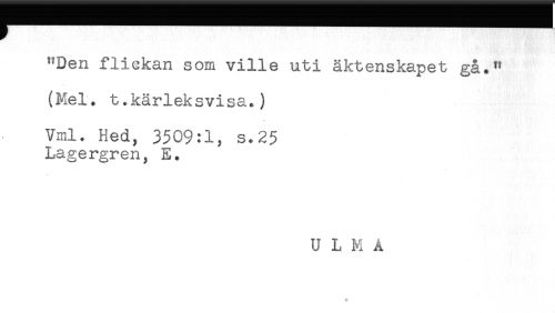 //// "Den flickan som ville uti äktenskapet gå." //// (Mel. t.kärleksvisa.) //// <* //// Vml. Hed, 3509:1, s.25 //// Lagergren, E. //// U L M Å //// t ////