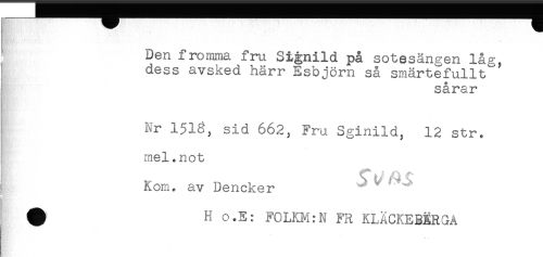 //// Den fromma fru Signild på sotesänsen låg, //// ! dess avsked härr Esbjörn så smärtefullt //// I sårar //// I Nr 1513, sid 662, Fru Sginild, 12 str. //// { mel.not //// i \ ^ , - -. //// I Kom. av Dencker //// { ^ H o.E: FOLKM:N FR KLACKEBERGA ////