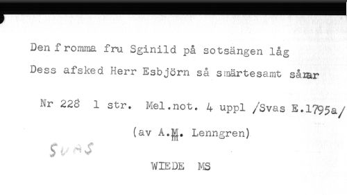//// Den fromma fru Sginild på sotsängen låg //// Dess afsked Herr Esbjörn så smärtesamt såiar //// Nr 228 1 str. Mel.not. 4 uppl /Svas E.l^$a //// /(av A.j^. Lenngren) //// y ^ ^ J //// WIEDE MS ////
