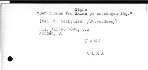 //// I Signe ! //// "Den fromma fru på sotsängen låg." //// . //// (Mel. t. folkvisag /Styvmodern/) //// K ' //// Hls. Älfta, 769.5, s.l //// Norden. 0. //// C //// U L M Å ////