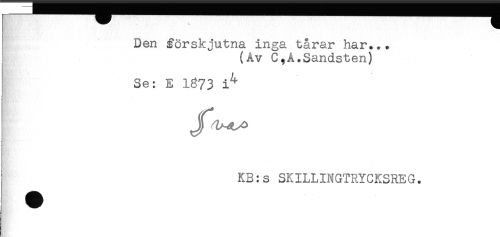 //// Den förskjutna inga tårar har... //// (Åv C,A.Sandsten) //// Se: E 1873 i^ //// KB:s SKILLINGTRYCKSREG. ////
