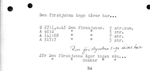 //// Den förskjutna inga tårar har... //// B 27:1,s.45 Den förskjutne. 5 str.kom. //// A 40:2 " t' 5 str. //// A 141:63 " " 7 str. //// A 517:7 " " 5 str. //// Jfr Den förskjutna äger ingen vän... //// " " önskar " " //// RA ////