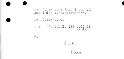 //// Den för skjutne äger ingen vän //// men i den tysta midnatten. //// ^ Den förskjutne. //// 5:4. FA. S.L.S. 328 s.90-91 //// nr 68 //// N. //// ÅBO //// * //// t ////