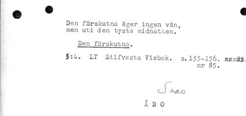 //// Den förskutna äger ingen vän, //// men uti den tysta midnatten. //// Den förskutna. //// 3:4. LT Silfvasts Visbok, s.155-156. //// nr 85. ////