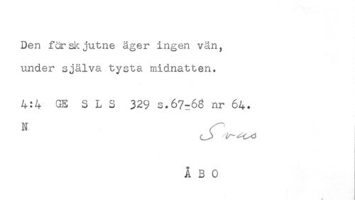 //// Den för skjutne äger ingen vän, //// under själva tysta midnatten. //// 4:4 GE S L S 329 s.67^68 nr 64. //// N r"" ////
