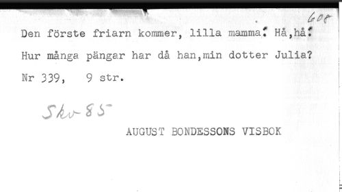 //// Den förste friarn kommer, lilla mamma. Hå,hå. //// Hur många pängar har då han,min dotter Julia? j //// ! //// Nr 339, 9 str. //// < //// AUGUST BONDESSONS VISBOK //// t //// i //// i //// i ////
