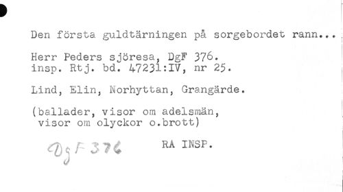 //// Den första guldtärningen på sorgebordet rann...; //// i //// Herr Peders sjöresa, DgF 376. //// insp. Rtj. bd. 47231:IV, nr 2$. ^ //// Lind, Elin, Norhyttan, Grangärde. //// i //// (ballader, visor om adelsmän, //// visor om olyckor o.brott) ////