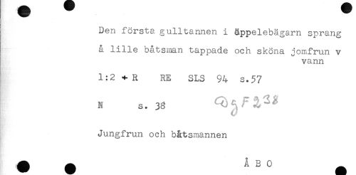 //// Den första gulitannen i äppelebägarn sprang //// å lille båtsman tappade och sköna jomfrun v //// vann //// 1:2 + R RE SLS 94 s.57 //// N s. 33 //// Jungfrun och båtsmannen ////