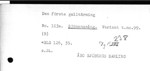 //// Den första gulltärning //// No. 103a. Sjömanssång. Variant t.no.99. //// (R) , //// =SLS 126, 59. ^ //// S *. ,.^/JL . //// ÅBO SJÖBERGS SÅI^-ILING ////