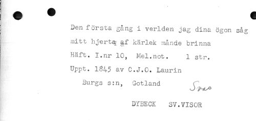 //// Den första gång i verlden jag dina ögon såg //// mitt hj-ertq §f kärlek månde brinna //// Häft. I.nr 10, Mel.not. 1 str. //// Uppt. 1345 av C.J.O. Laurin //// Burgs s:n, Gotland f //// J yn^o //// s //// DYBECK SV.VISOR ////