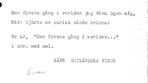 //// Den första gång i verlden jag dina ögon såg, - //// Mitt hjärta av kärlek månde brinna: ! //// < //// Nr 42, "Den första gång i verlden..." ; //// < //// i //// i- //// 1 str. med mel. //// SÄVE GOTLÄNDSKA VISOR //// J ////
