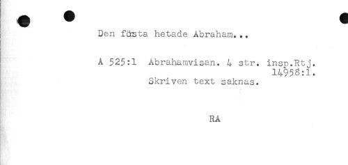 //// # * * //// ! Den första hetade Abraham. .. //// ! //// A 525:1 Abrahamvisan. 4 str. insp.Rti. //// 14956:1. //// Skriven text saknas. //// * //// RÅ ////