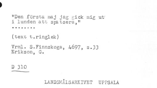//// "Den första maj jag gick mig ut //// i lunden att spatsera," //// (texu t.ringlek) //// Vrml. S.Finnskoga, 4697, s.33 //// Erikson, G. //// D 310 //// LÄ ND SMÅ LS ARKIVET UPPSALA ////