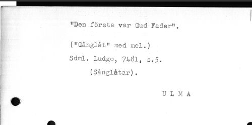 //// "Den första var Gud Fader". //// . t //// —.... //// ("Gånglåt" med mel.) //// I Sdml. Ludgo, 74^1, s.5. //// ' (Sånglåtar). //// t ULMA ////