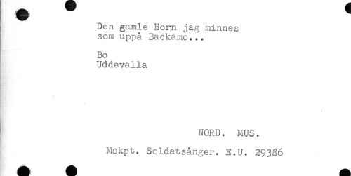 //// Den gamle Horn jag minnes //// som uppå Backamo... //// Bo //// Uddevalla //// NORD. MUS. //// R - < //// Rj-' //// Mskpt. Soldatsånger. E.U. 29336 ////