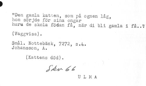 //// "Den gamla katten, som på ognen låg, //// hon sörjde för sina ongar //// huru de skola födan få, när di bli gamla i få..'.' //// (Vaggvisa). //// Smal. Nottebäck, 7272, s.4. //// Johansson, A. //// (Kattens död). //// ULMA ////