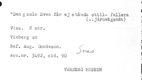 //// "Den gamla Svea får ej stånda still- fallera ^ //// (..järnvägsnät) ^ //// Visa. 8 str. //// H //// = //// Vinberg sn //// H //// 5 //// Ref. Åug. Bondeson. j //// Acc.nr. 3492, sid. 90 ! //// I //// VÅRBERG MUSEUM I //// L //// H ////