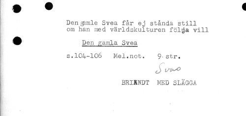 //// Den^mle Svea får ej stånda still //// om han med världskulturen fölga vill //// ^ Den gamla Svea //// s.104-106 Mel.not. 9^str. //// BRIKNDT MED SLÄGGA //// - . ////