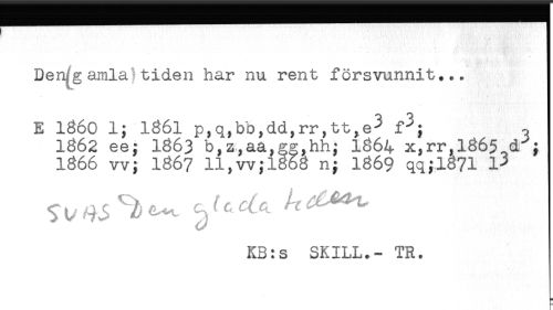 //// ? ' * . ' , ' : //// Den^gamla! tiden har nu rent försvunnit... //// E 1860 1; 1861 p,q,bb,dd,rr,tt,e^ f^; o //// 1862 ee; I863 b,z,aa,gg,hh; 1864 x,rr,l365.d^; //// 1866 Wi 1867 11, vv; 1868 n; 1869 qqil871 //// KB:s SKILL.- TR. ////