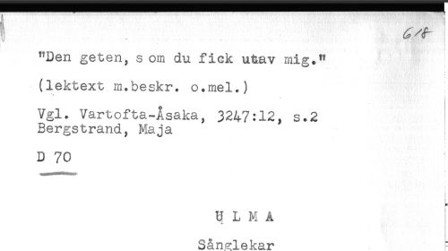 //// 'J ' T' - ' - - - -- - - . ^ t' //// t //// ! //// "Den geten, s om du fick utav mig." //// t //// (lektext m.beskr. o.mel.) //// ^ : //// i //// Vgl. Vartofta-Åsaka, 3247:12, s.2 //// Bergstrand, Maja //// D 70 //// < //// ULMA //// -L //// Sånglekar = ////