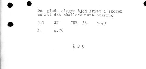 //// Den glada sången &jöd fritt i skogen //// i så a tt det skallade runt omkring //// 3:7 SN INE 34 s.40 //// N. s.76 //// ÅBO ////
