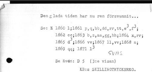 //// Den g lada tiden har nu ren försvunnit... //// Se: E 1360 l;l86l p,q,bb,dd,rr,tt,e^,f^; //// 1862 cc;l863 b,z,aa,gg,hh;l864 x,rr; //// 1865 d^;l366 vv;l867 11,vv;1868 n; //// 1869 qq^ 1871 l3 //// K Se ävdn: D $ (3:e visan) //// KB:s SKILLINGTRYCKSREG. ////